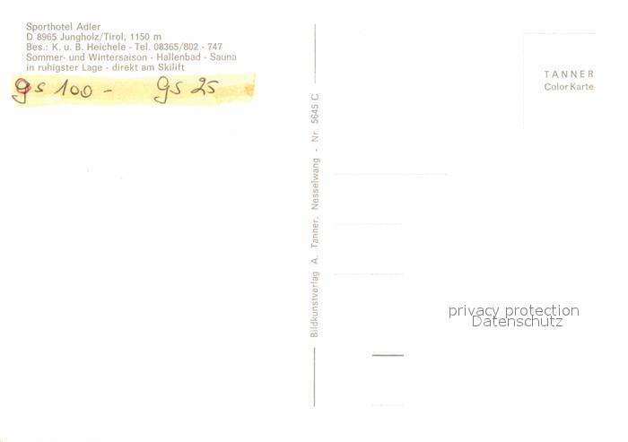 72882960 Jungholz Tirol Sporthotel Adler postalisch nicht gelaufen Erhaltung siehe scans [AndreD76] KatCode: 11390331070818