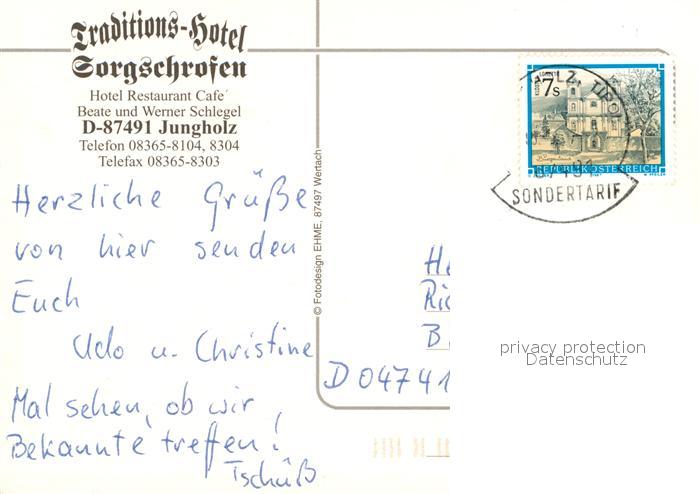 72967815 alte Postkarte Jungholz Wertach Traditionshotel Sorgschrofen Restaurant Cafe postalisch gelaufen Erhaltung siehe scans [LiesaD40] KatCode: 11110009780145
