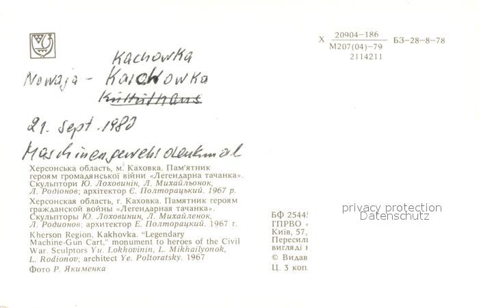 13597702 Kachowka Maschinengewehr Denkmal postalisch nicht gelaufen Erhaltung siehe scans [WerneD78] Wern Katcode 11540