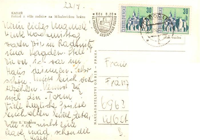old postcard Kadan Kaaden CZ Pohled z veze radnice na Mikulovickou branu postalisch gelaufen Erhaltung siehe scans [FriedD77]