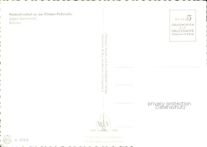 72312606 Kaernten Heldenfriedhof an der Ploecken Passstrasse im Valentintal postalisch nicht gelaufen Erhaltung siehe scans KatCode: 11390211020201