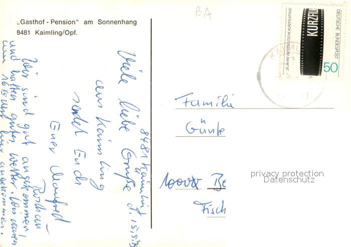 73649185 alte Postkarte Kaimling Gasthof Pension am Sonnenhang Restaurant Bar Fremdenzimmer postalisch gelaufen Erhaltung siehe scans [FriedD77] KatCode: 11110009374162