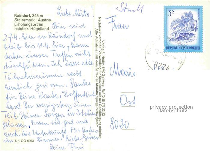 74156147 alte Postkarte Kaindorf Oststeiermark AT Schwanenteich Rasthof Hotel Kirche Erholungsort postalisch gelaufen Erhaltung siehe scans [FriedD77] KatCode: 11390224060715
