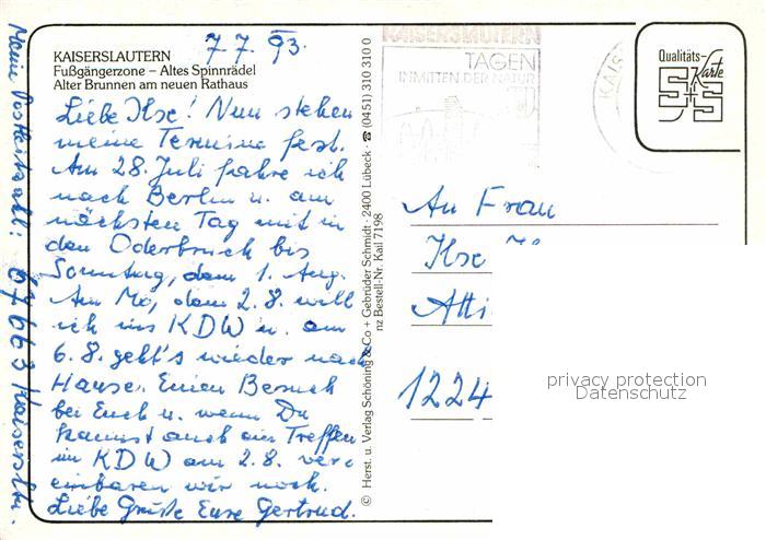 72846445 alte Postkarte Kaiserslautern Fussgaengerzone Altes Spinnraedel alter Brunnen Rathaus postalisch gelaufen Erhaltung siehe scans [KathaD81] KatCode: 11110007312000