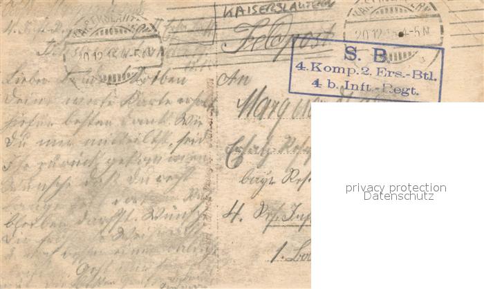 33211899 alte Postkarte Kaiserslautern s. B. 4. Komp. 2 ERs.-Btl. 4 b Inft.-Regt. postalisch gelaufen Feldpost Erhaltung siehe scans [NatalD47] KatCode: 11110007312000