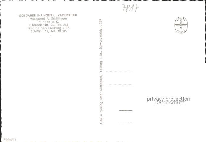 31720933 Kaiserstuhl Region Metzgerei A. Schilliger postalisch nicht gelaufen Erhaltung siehe scans KatCode: 11110008315059