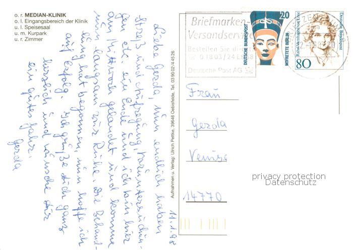 73776305 alte Postkarte Kalbe Milde Median-Klinik Eingangsbereich Speisesaal Kurpark postalisch gelaufen Erhaltung siehe scans [LiesaD40] KatCode: 11110015081240