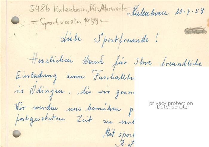 73697283 alte Postkarte Kalenborn Ahrweiler Spielvereinigung Stempel Sportverein postalisch gelaufen Erhaltung siehe scans [FriedD77] KatCode: 11110007131036