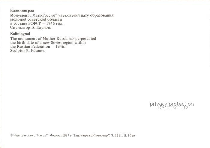 Kaliningrad The monument of Mother Russia postalisch nicht gelaufen Erhaltung siehe scans