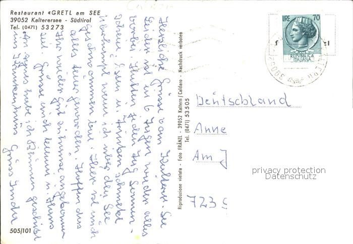 old postcard Kalterer See Suedtirol Restaurant Gretl am See postalisch gelaufen Erhaltung siehe scans