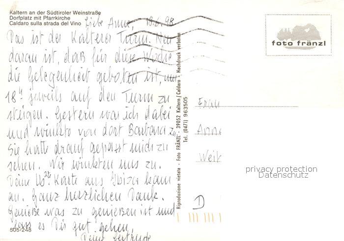 old postcard Kaltern Weinstrasse Tirol Dorfplatz Pfarrkirche postalisch gelaufen Erhaltung siehe scans [PaolaD17]