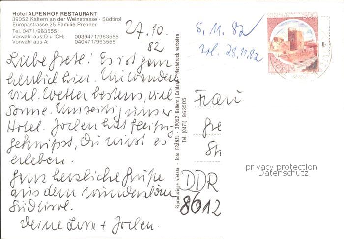 old postcard Kaltern Weinstrasse Tirol Hotel Alpenhof postalisch gelaufen Erhaltung siehe scans