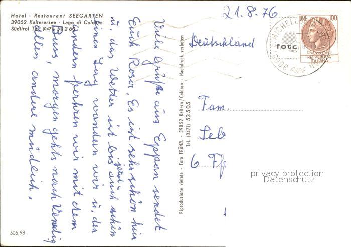 old postcard Kaltern Weinstrasse Tirol Hotel Restaurant Seegarten postalisch gelaufen Erhaltung siehe scans