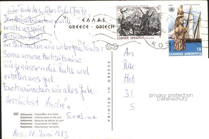 old postcard Kalymnos Fischerboot im Hafen postalisch gelaufen Erhaltung siehe scans