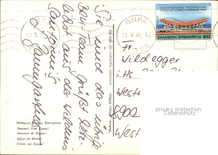 old postcard Kamari Panorama Denkmal Abendstimmung postalisch gelaufen