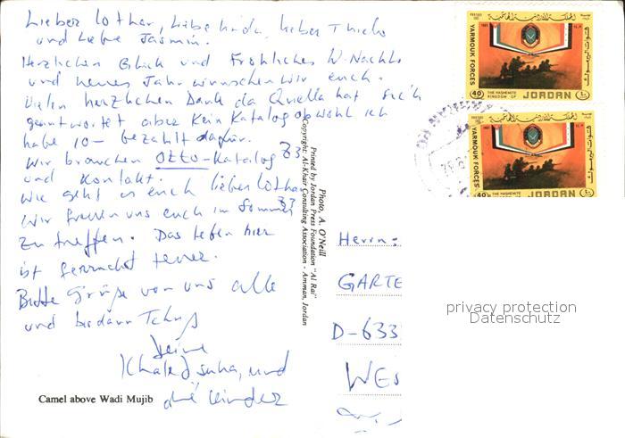 alte Postkarte Kamel Camel Chameau Wadi Mujib Jordan postalisch gelaufen Erhaltung siehe scans [PaolaD17 kt100box]