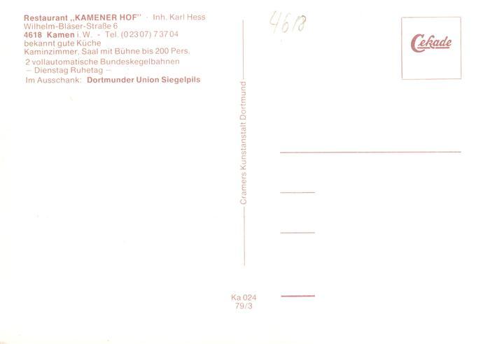 73896579 Kamen Westfalen Kamener Hof Restaurant Kegelbahn postalisch nicht gelaufen Erhaltung siehe scans [FriedD77] KatCode: 11110005978020