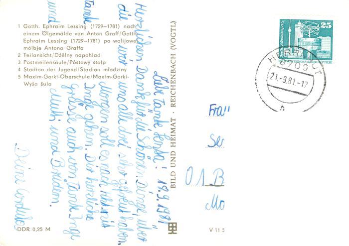 73905351 alte Postkarte Kamenz Sachsen Lessing oelgemaelde Teilansicht Postmeilensaeule Stadion der Jugend Maxim Gorki Oberschule postalisch gelaufen Erhaltung siehe scans [WerneD78] KatCode: 11110014292210