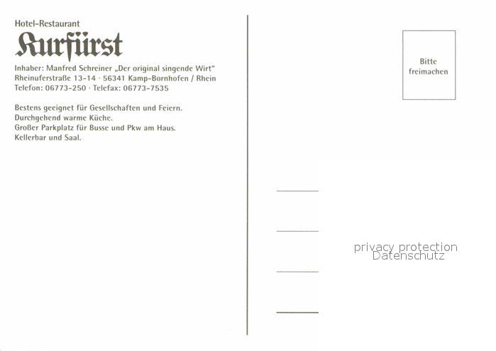 72615505 Kamp-Bornhofen Hotel Restaurant Kurfuerst mit Gaestehaus San Augustin Singender Wirt postalisch nicht gelaufen Erhaltung siehe scans [WerneD78] KatCode: 11110007141066