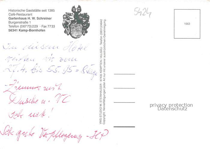 74040975 Kamp-Bornhofen Rhein Gartenhotel Schreiner Restaurant Cafe postalisch nicht gelaufen Erhaltung siehe scans [WerneD78] KatCode: 11110007141066