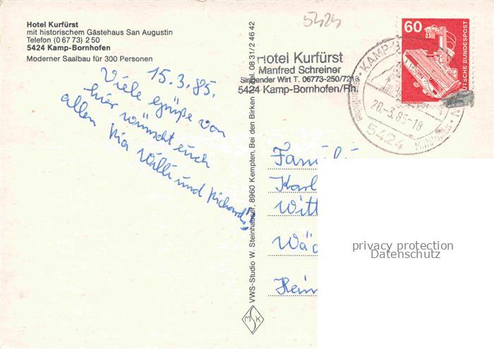 74050857 alte Postkarte Kamp-Bornhofen Rhein Hotel Kurfuerst mit Gaestehaus San Augustin postalisch gelaufen Erhaltung siehe scans [WerneD78] KatCode: 11110007141066
