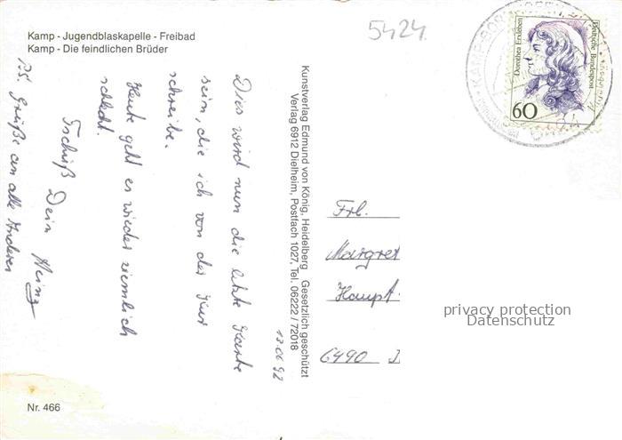 74050870 alte Postkarte Kamp-Bornhofen Rhein Rheinpartien Die feindlichen Brueder Fahrgastschiff Fliegeraufnahmen postalisch gelaufen Erhaltung siehe scans [WerneD78] KatCode: 11110007141066