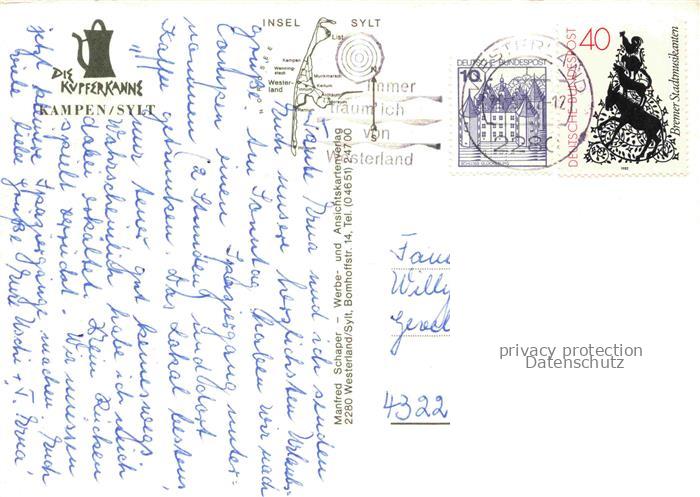 74156926 alte Postkarte Kampen Sylt Kupferkanne Restaurant Sylt Nordsee Garten Terrasse Destillieranlage Innenraum postalisch gelaufen Erhaltung siehe scans [Karloger] KatCode: 11110001054061
