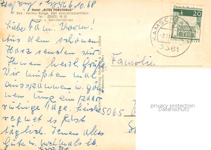 73784947 alte Postkarte Kamschlacken Hotel Altes Forsthaus Kutschfahrten postalisch gelaufen Erhaltung siehe scans [FriedD77] KatCode: 11110003156011