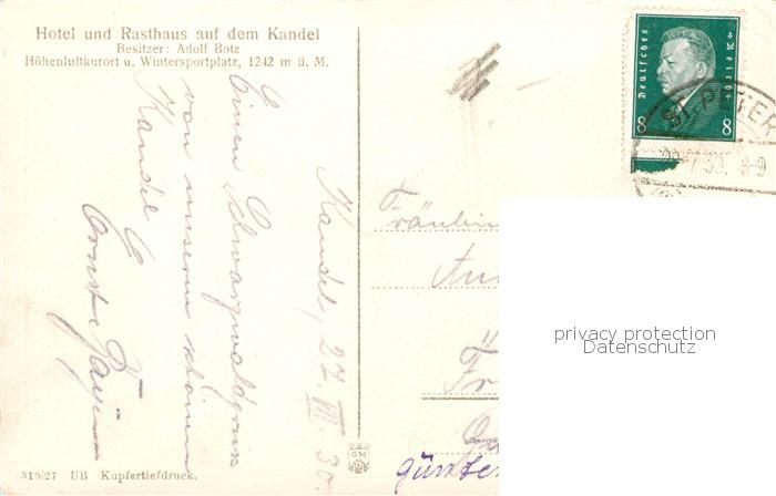 73810093 alte Postkarte Kandel Breisgau Hotel und Rasthaus auf dem Kandel postalisch gelaufen Erhaltung siehe scans [FriedD77] KatCode: 11110008316056