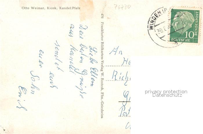 33664455 alte Postkarte Kandel Pfalz Panorama Bienwaldstadt Schwanenweiher Hauptstrasse Rathaus postalisch gelaufen Erhaltung siehe scans [FriedD77] KatCode: 11110007334013