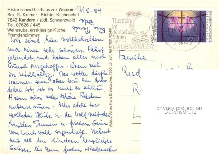 73122156 alte Postkarte Kandern Historisches Gasthaus zur Weserei postalisch gelaufen Erhaltung siehe scans [KathaD81] KatCode: 11110008336045
