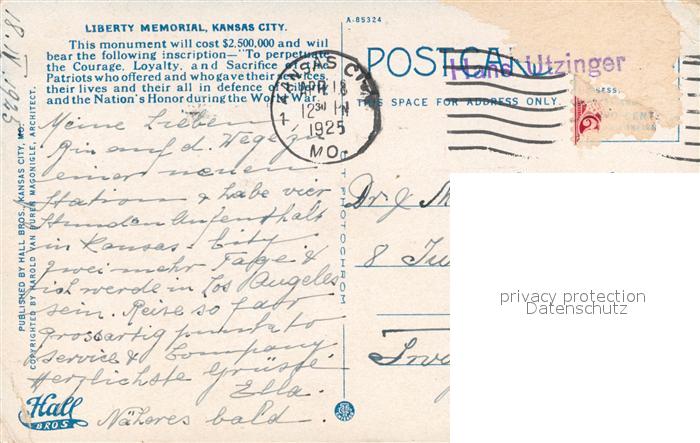 73297297 old postcard Kansas City Kansas Liberty Memorial postalisch gelaufen Erhaltung siehe scans [WerneD78] KatCode: 14140180000000