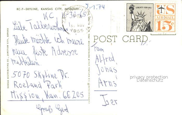72275287 old postcard Kansas City Missouri Skyline postalisch gelaufen Erhaltung siehe scans KatCode: 14140270000000