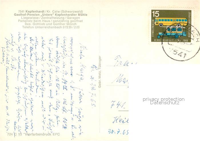 73182073 alte Postkarte Kapfenhardt Gasthof Pension Untere Kapfenhardter Muehle Schwarzwald postalisch gelaufen Erhaltung siehe scans [FriedD77] KatCode: 11110008235073