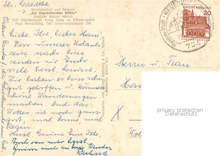 73659643 alte Postkarte Kapfenhardt Waldgasthof Pension Zur Kapfenhardter Muehle im Schwarzwald postalisch gelaufen Erhaltung siehe scans [FriedD77] KatCode: 11110008235073