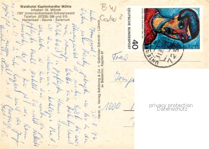 73641292 alte Postkarte Kapfenhardt Waldhotel Untere Kapfenhardter Muehle postalisch gelaufen Erhaltung siehe scans [WerneD78] KatCode: 11110008235073