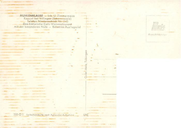 73897717 Kappel Niedereschach Muehlenklause Cafe Weinrestaurant postalisch nicht gelaufen Erhaltung siehe scans [FriedD77] KatCode: 11110008326041