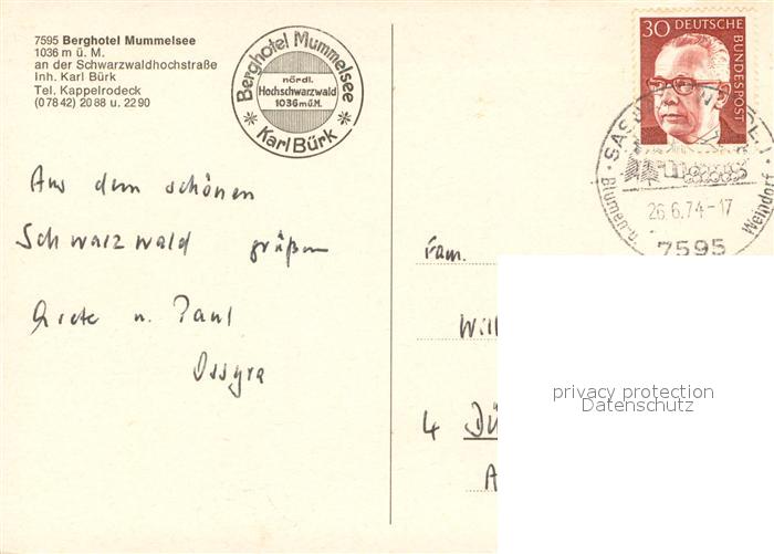 73718045 alte Postkarte Kappelrodeck Berghotel Mummelsee postalisch gelaufen Erhaltung siehe scans [WerneD78] KatCode: 11110008317056