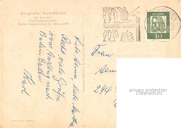 73689334 alte Postkarte Kappelrodeck Berghotel Mummelsee Fliegeraufnahme postalisch gelaufen Erhaltung siehe scans [FriedD77] KatCode: 11110008317056