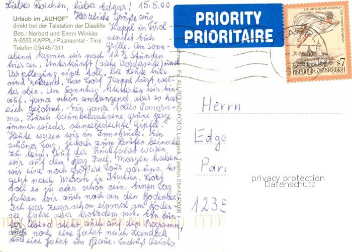 72719231 alte Postkarte Kappl Tirol Gasthof Pension Auhof im Paznauntal postalisch gelaufen Erhaltung siehe scans [FriedD77] KatCode: 11390334070609