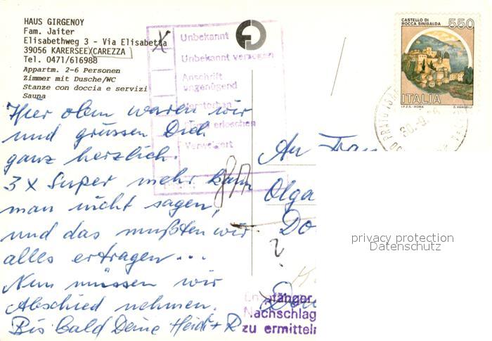 73162951 alte Postkarte Karersee Suedtirol Huas Girgenoy postalisch gelaufen Erhaltung siehe scans [LiesaD40] KatCode: 11390