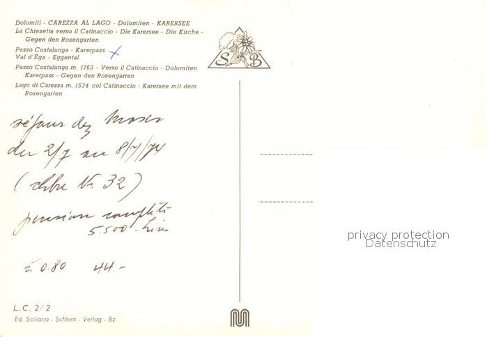 73365039 Karersee Suedtirol Kirche Karerpass Rosengarten Eggental postalisch nicht gelaufen Erhaltung siehe scans [WerneD78] KatCode: 11390