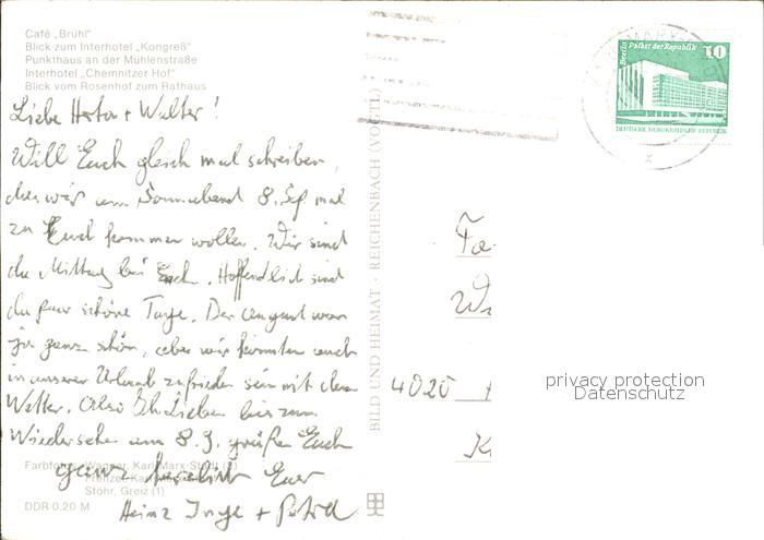 72306636 alte Postkarte Karl-Marx-Stadt CHEMNITZ Cafe Bruehl Interhotel Kongress Punkthaus Interhotel Chemnitzer Hof Rathausblick postalisch gelaufen Erhaltung siehe scans KatCode: 11110014161000