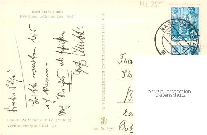 73833543 Karl-Marx-Stadt CHEMNITZ HO Hotel Chemnitzer Hof postalisch gelaufen Erhaltung siehe scans [FriedD77] alte Postkarte Frie Katcode 11110014161000