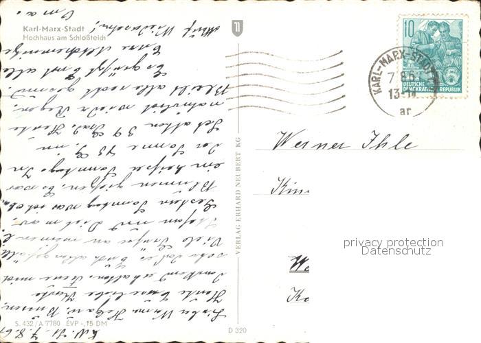 72034533 alte Postkarte Karl-Marx-Stadt CHEMNITZ Hochhaus am Schlossteich postalisch gelaufen Erhaltung siehe scans KatCode: 11110014161000