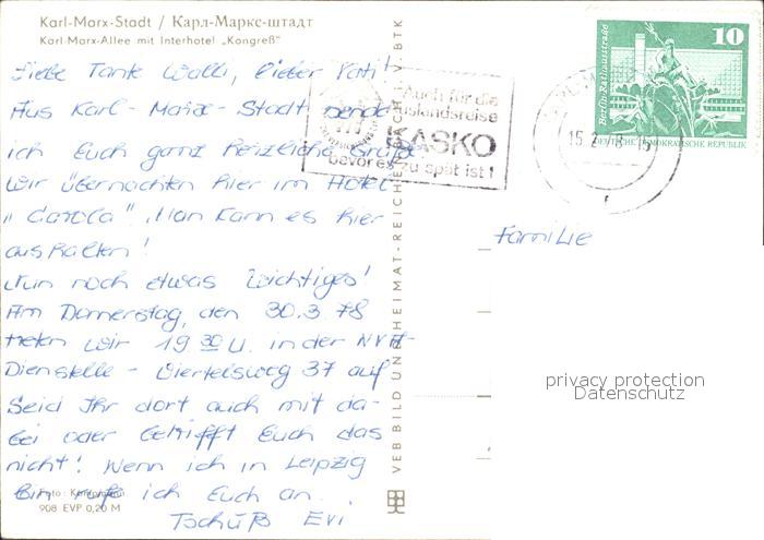 72249293 alte Postkarte Karl-Marx-Stadt CHEMNITZ Karl Marx Allee mit Interhotel Kongress postalisch gelaufen Erhaltung siehe scans KatCode: 11110014161000