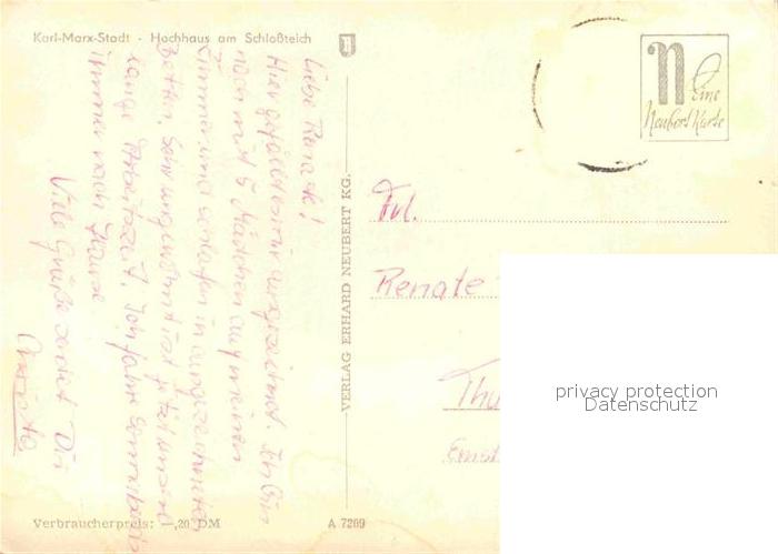 72705134 alte Postkarte Karl-Marx-Stadt Hochhaus am Schlossteich postalisch gelaufen Erhaltung siehe scans [AndreD76] KatCode: 11110014161000