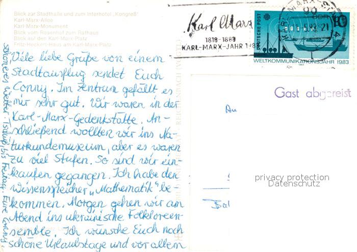 73295254 alte Postkarte Karl-Marx-Stadt Interhotel Kongress Karl Marx Allee mit Monument Rathaus Karl Marx Platz Fritz Heckert Haus postalisch gelaufen Erhaltung siehe scans [WerneD78] KatCode: 11110014161000