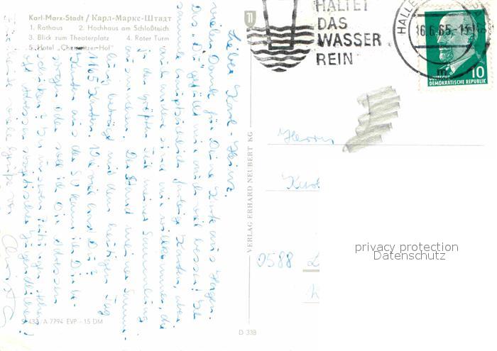 72760602 alte Postkarte Karl-Marx-Stadt Rathaus Hochhaus am Schlossteich Theaterplatz Roter-Turm Hotel-Chemnitzer-Hof postalisch gelaufen Erhaltung siehe scans [LiesaD40] KatCode: 11110014161000