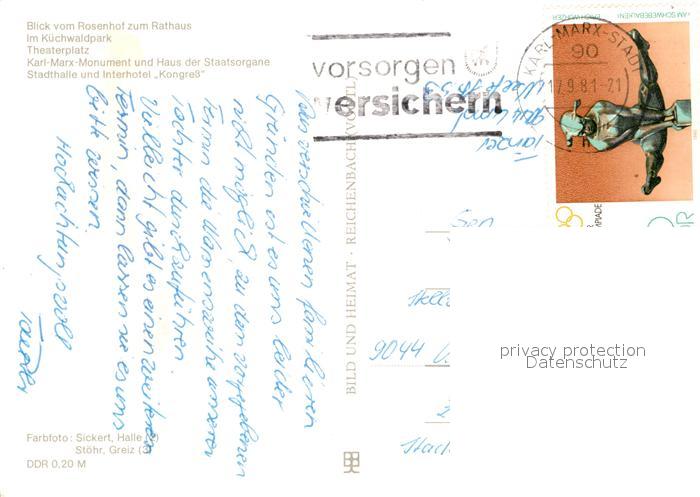 73124582 alte Postkarte Karl-Marx-Stadt Rathaus Kuechwaldpark Theaterplatz Karl Marx Monument Interhotel postalisch gelaufen Erhaltung siehe scans [KathaD81] KatCode: 11110014161000